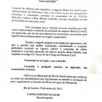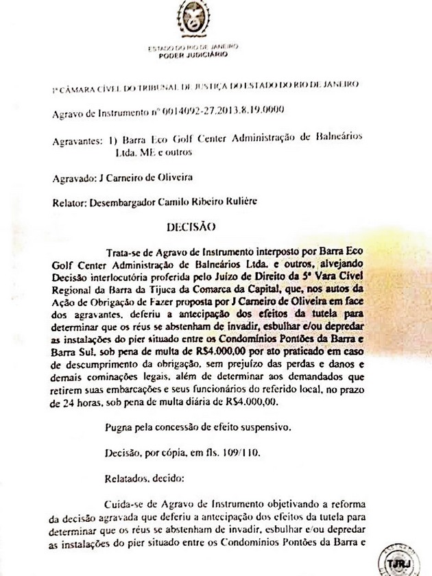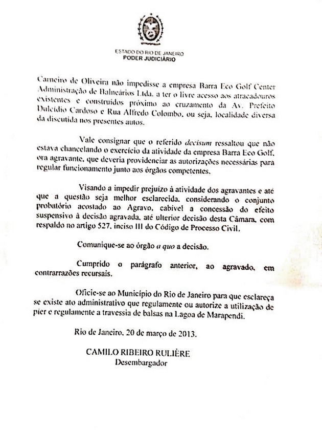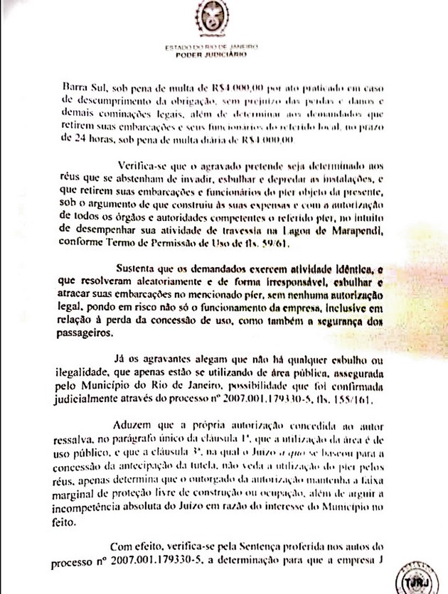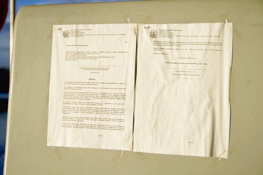 No início do mês passado foi afixado uma cópia da liminar sob número 0005767-18.2013.8.19.0209 nas balsas que fazem a ligação até a praia na Reserva pela empresa Barra Balsas. Tal documento foi até informado pela advogada que defende o direitos do Sr J. Carneiro, Dra Maysa. Neste, a Juíza Titular da 5 ª Vara Cível da Barra da Tijuca, Adriana Angelo de Araújo Azevedo Maia determinava que a empresa Eco Balsas deixasse de atracar no píer construído pela Barra Balsas sob multa diária de R$ 4 mil reais.