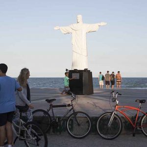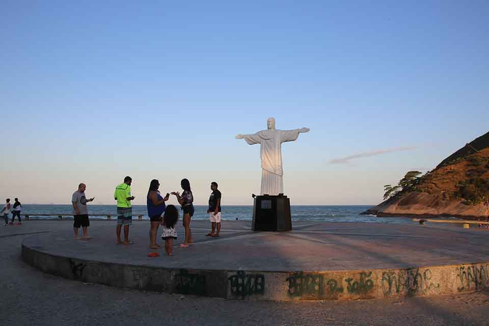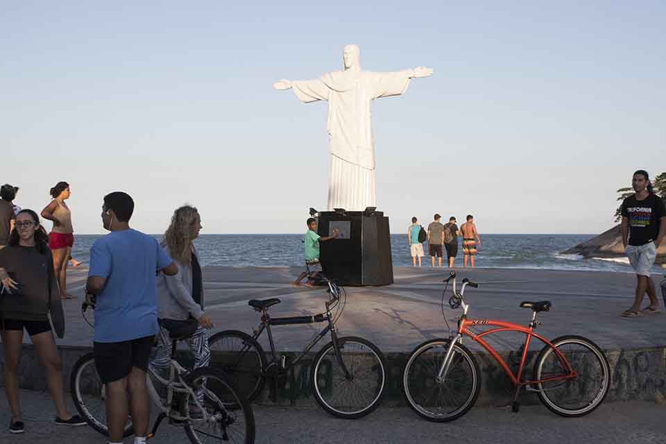 As pessoas vão caminhando pela ciclovia pela Praça Tim Maia e opa, o Cristo?