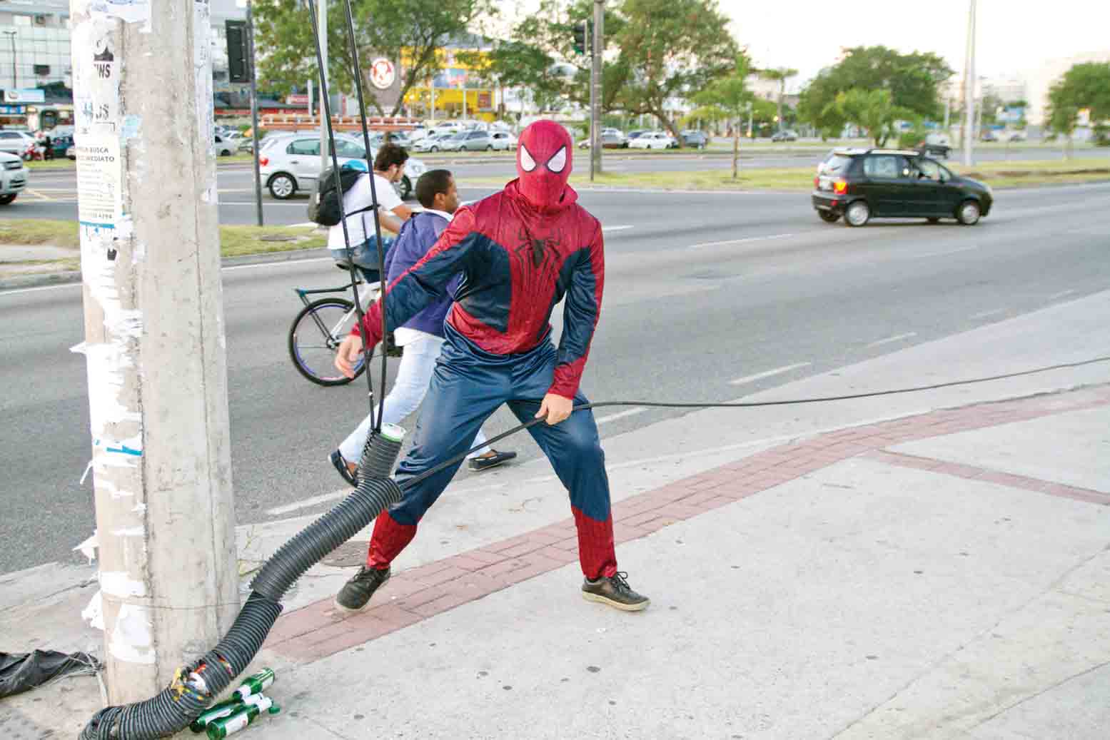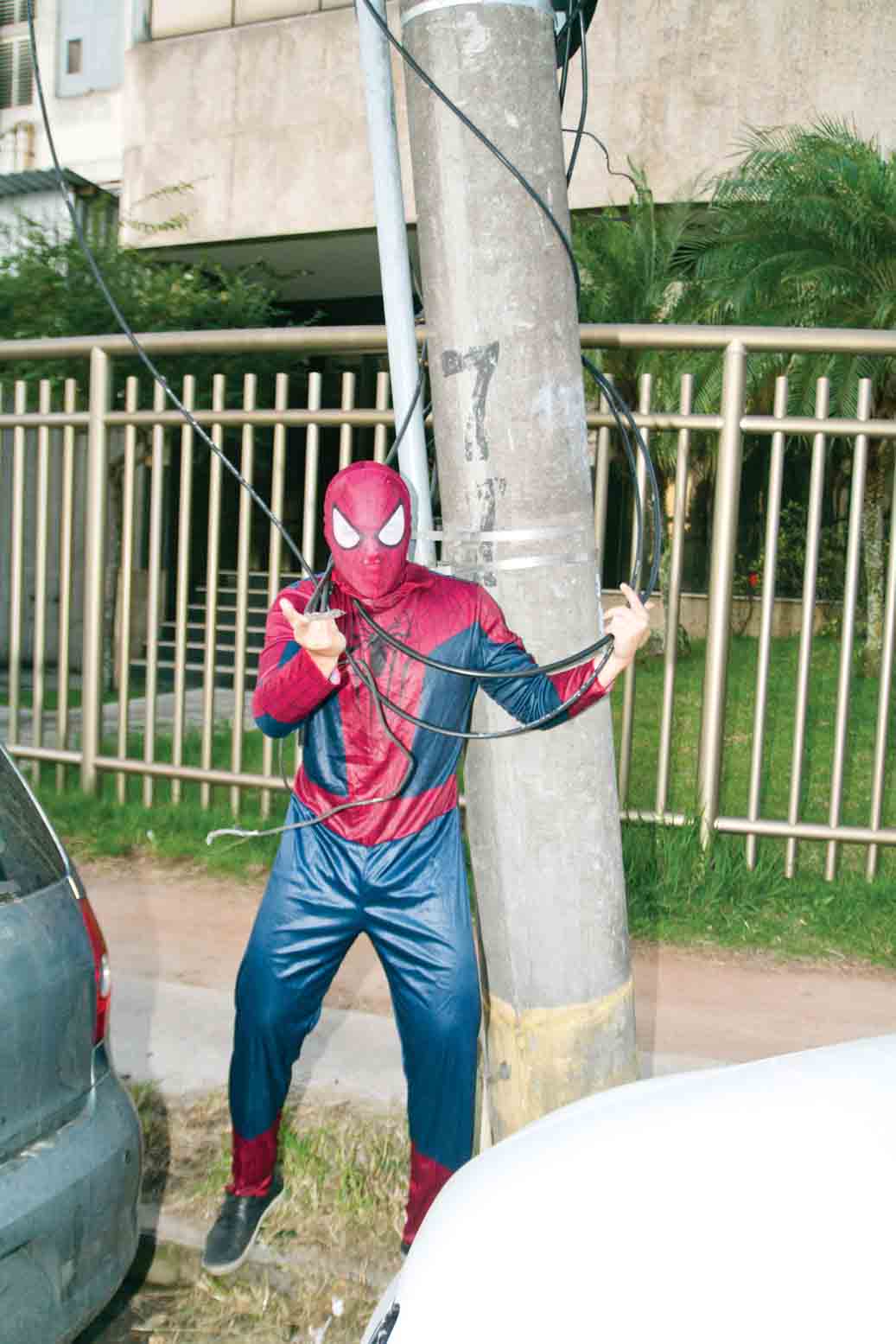 Partimos para a esquina das ruas Gelson da Fonseca com Maurício da Costa da Faria. Nosso Aranha reparou que no mês passado estivemos bem próximo dali, há uns poucos metros que continua tudo lá. Quase foi dar uma pendurada para matar a saudade. Mas se conteve em experimentar o do poste que estava ali aos rolos! Como era fim de tarde, por volta das 17 H, muitos trabalhadores pararam para ver suas ações e acabou posando para fotos. Um deles, Sr. Edevanildo dos Santos, morador de uma simpática comunidade do outro lado da Avenida das Américas disse que em frente ao supermarket tinha um muito maior. Chegando lá percebemos que o fio estava jogado no chão e vai de uma ponta a outra , com uns 30 metros de fio jogados no chão, bem em frente ao ponto de ônibus.