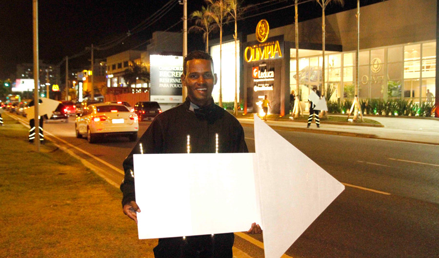 Chamar a atenção de alguém enquanto está dirigindo não é fácil e imagine em vias de alta velocidade como a Avenida das Américas. E no mercado publicitário o que não falta é criatividade. Quem nunca viu nos fins de semana o palhacinho, mesmo no sol de verão, dançando e balançando a setinha indicando um lançamento imobiliário ou apresentando um feirão de carros? Mas isso de dia. Por que à noite eles estão mais reluzentes e chamativos. Agora existe o Homem LED. Uma dezena deles. Na verdade, não existe distinção por sexo, já que mulheres balançam as setas indicando o lançamento do condomínio Olímpia, criado pela construtora Leducca, que mantém um stand pouco depois do McDonald´s nas Américas, na altura do número 16 000.