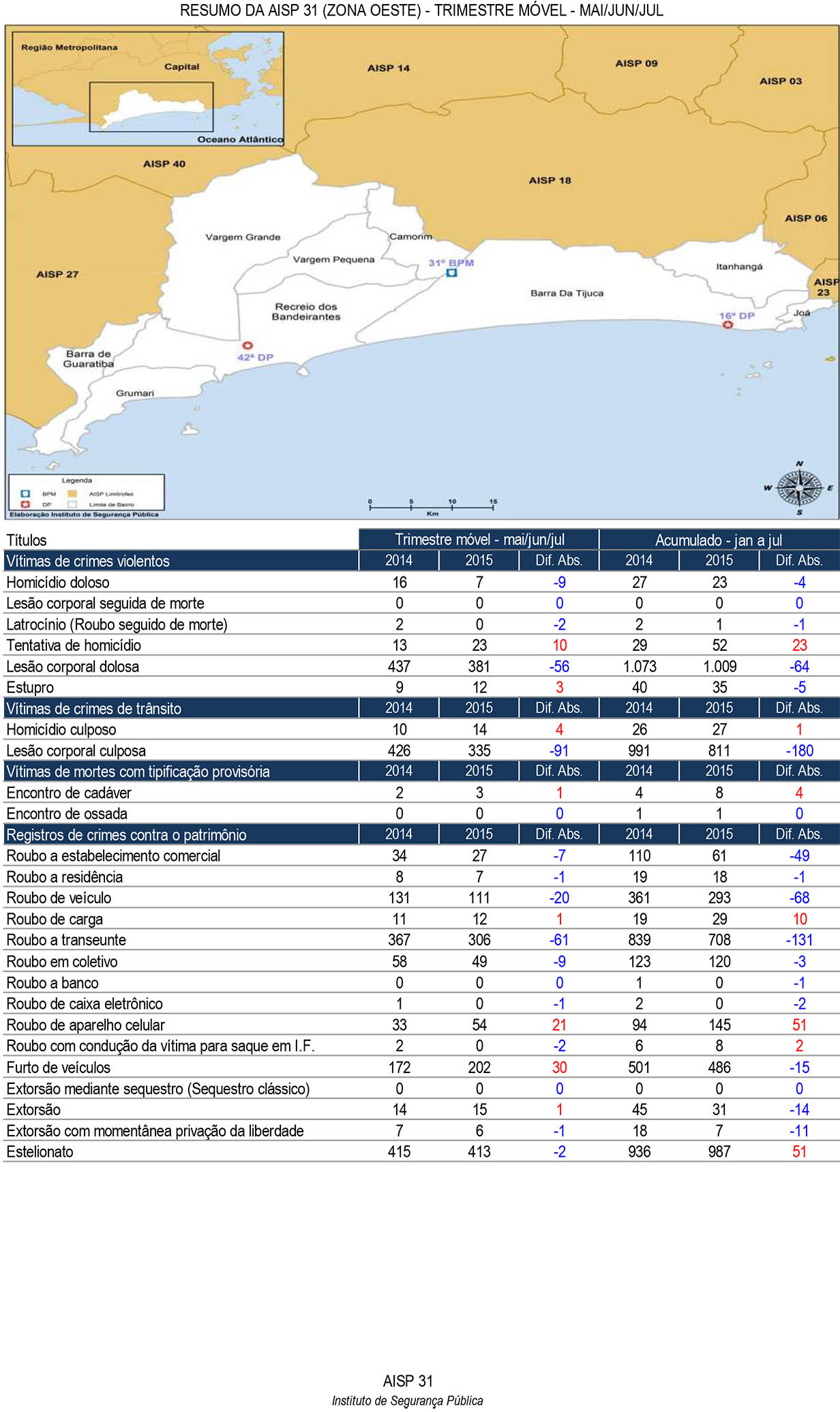 Curiosamente os dados ISP, Instituto de Segurança Pública, mostra que a região da AISP31 , mostram que latrocínio caiu na área, com dois casos no período desse trimestre para nenhum até julho desse ano.