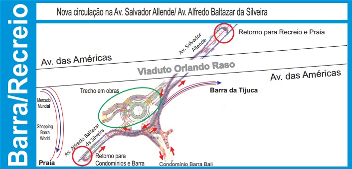 Para o morador chegar em casa, vindo da Av. Salvador Allende, terá que seguir pelo desvio da obra no sentido praia e utilizar o novo retorno feito antes do Shopping Barra World.