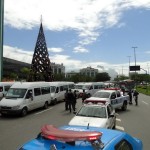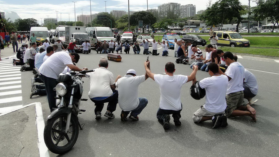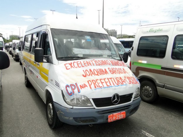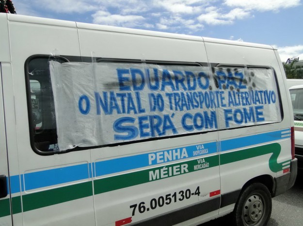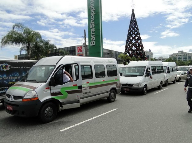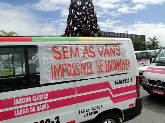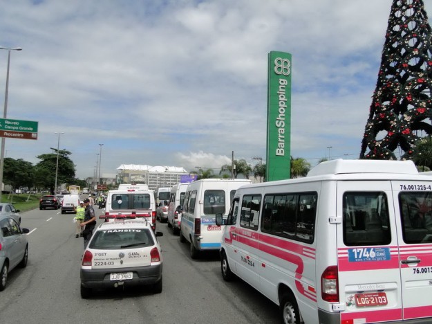 Cerca de 30 motoristas protestam contra as novas regras do STPL e pedem o direito de trabalhar em rotas alternativas na região de Jacarepaguá onde o sistema foi implementado há cerca de um mês. Em frente ao Barra Shopping se ajoelharam e rezaram o Pai Nosso. Nas faixas penduradas nas vans , frases direcionadas ao Ministros do STF Joaquim Barbosa pedindo CPI na Prefeitura e outra onde estava escrito” Eduardo Paz(sic) o Natal do transporte alternativo será com fome”.