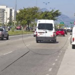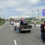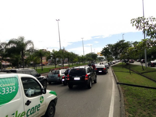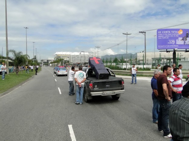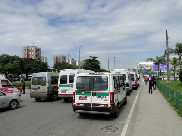 O congestionamento na Avenida das Américas chegou por volta das 9 H na Gláucio Gil, no Recreio, para desespero dos motoristas.Um grupo com cerca de 30 vans saiu por volta das 4 H da manhã do HSBC Arena , na Abelardo Bueno, e se dirigiu lentamente pela Ayrton Senna até parar no Cebolão , na altura do Terminal Alvorada . Ali, permaneceram por mais de 20 minutos, impedindo até a saída dos ônibus das estações. Passageiros cansados de esperar saltavam dos coletivos e seguiam a pé. Agentes de trânsito da CET – Rio interditaram algumas pistas centrais da Avenida das Américas tentando evitar o pior, mas não adiantou e o engarrafamento só cresceu. Do shopping Millenium ao Barra Shopping somente as motos tinham condições de trafegar. Nem em dias de feriado prolongado a via fica daquele jeito.