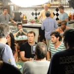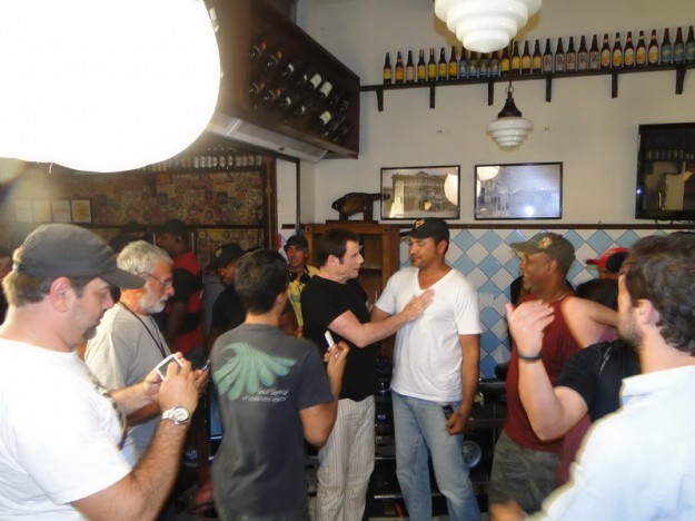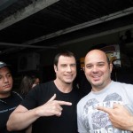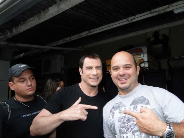 __”Cut! Thank you, Mr. John”. Aplausos de todos e foi a senha para avançarem no astro de Greese e tantos outros. Avançou a família do Ricardo, os empregados da casa, os câmeras e até os diretores do comercial como constam na foto. A esposa do Ricardo levou um autógrafo no DVD do filme Greese. A esposa e sogra do outro sócio, Leonardo Quelhas, ganharam uma foto de lembrança. O staff brindou ao final da gravação com caipirinhas regadas por uma das 800 garrafas de Ypióca que enfeitavam o paredão do bar principal e Mr. John Travolta seguiu para o ponto da Heli Rio, nas Américas, em direção à Lagoa Rodrigo de Freitas e seguir sua programação. No caminho, aquele que vos escreve estava no meio e sacou sua câmera e entregou a qualquer um que estava na frente para tirar uma foto. Como eu estava com uma camisa da Harley Davidson ele sorriu: