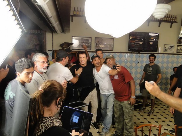 Andou pelo calçadão, tirou os sapatos e fingiu jogar futebol. No comercial, marca até um golaço meio sem querer, mas suas batida na bola foi repetida algumas vezes. Mas isso, sem tirar o sorriso de Travolta que se apresentou bem mais magro do que nas suas últimas aparições em público. Permaneceu o dia inteiro com a mesma calça listrada(só se tinha mais de uma) e uma camisa preta. Na praça, um arsenal foi montado e uma enorme tenda foi levantada em frente a pista de skate para os figurantes e pessoal da produtora Sentimental, de São Paulo. No término da primeira sessão de cenas, foi descansar no hotel ali mesmo ao lado, da rede Protel, de frente para o mar da Macumba. As 16 H em ponto, como o programado, chegou pela entrada da cozinha do Buteco Tradicional com o mesmo sorriso “Colgate”. Repetiu algumas cenas de brinde com a cachaça e pediu a produção para mexer no TP(tele prompter) que é o aparelho instalado na frente da camera principal e passa o texto que o ator iria falar. Ali dizia: