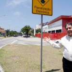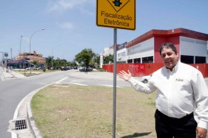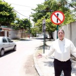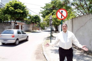 Entramos na contra-mão do retorno da Guinard e seguimos sentido Via 9 e dobramos à direita, na Praça Miguel Osório e vamos pela Guilherme Baptista, mas não podemos. É contra-mão também. Seguimos mais uma rua e chegamos na Gustavo Corção e vamos entrar à direita novamente pela General Orlando Geisel e aí, nos deparamos com essa placa em que está nosso leitor Paulo Cesar de braços abertos. É contra-mão de novo!! Vejam na foto que parece ser comum na região porque o veículo ao lado passa tranquilamente em direção à Guinard, porque no outro cruzamento, com a Rua Guilherme Baptista já não é mais proibido andar em direção às Américas e passa a ser mão dupla.
